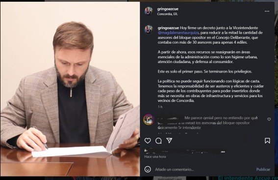 «Se terminaron los privilegios», dijo. «La política no puede seguir funcionando con lógicas de casta. Tenemos la responsabilidad de ser austeros y eficientes y cuidar cada peso de los contribuyentes para poder invertirlos donde más se necesita: en obras de infraestructura y servicios para los vecinos de Concordia», agregó.