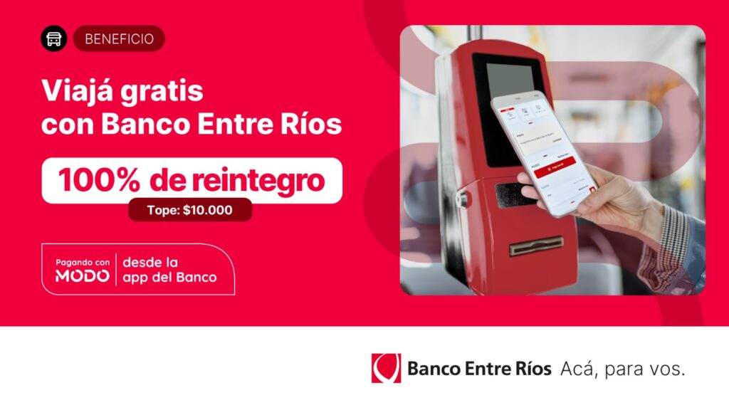 Bajo el lema “Viajá gratis con Banco Entre Ríos”, la promoción estará vigente hasta el 22 de febrero. Durante ese período, los usuarios que paguen sus viajes en colectivo utilizando MODO desde la app o desde la aplicación de Banco Entre Ríos recibirán un reintegro del 100% del importe, con un tope mensual de $10.000 por cliente.