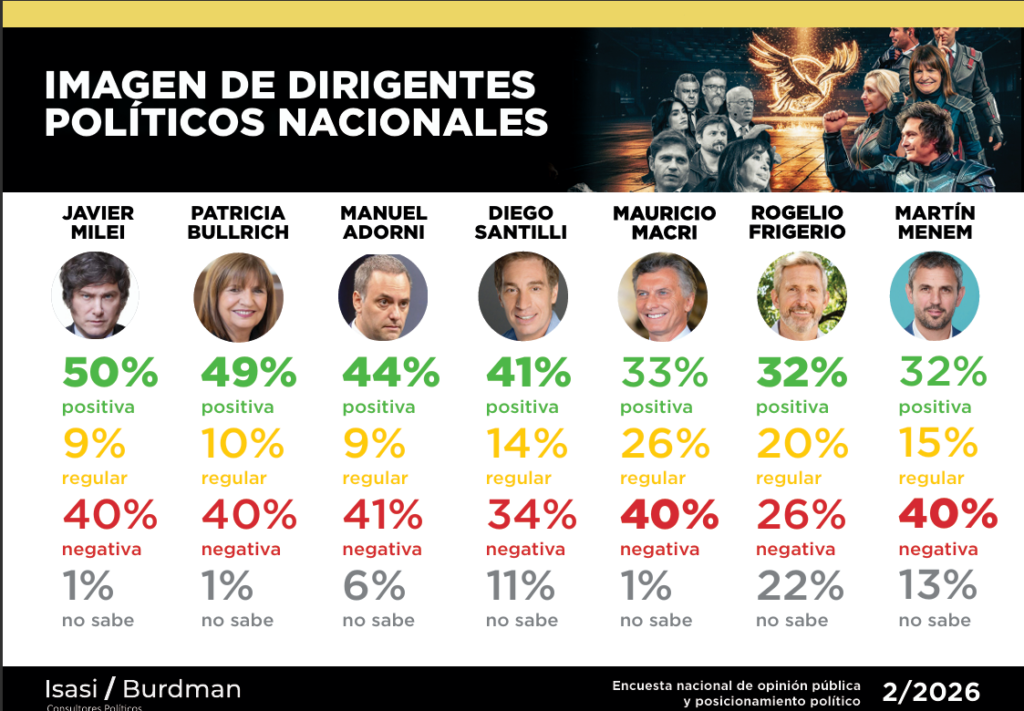 Si bien gran parte del estudio se concentra en la imagen de Javier Milei y en la intención de voto de cara a una eventual reelección en 2027, los números también permiten leer el lugar que ocupa Rogelio Frigerio dentro del mapa político argentino.