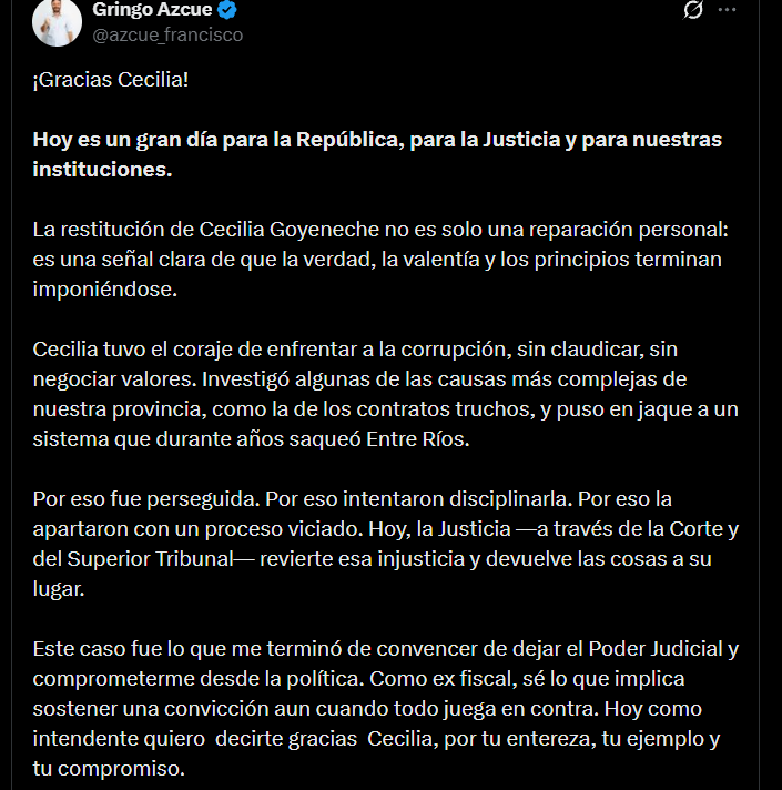 «La restitución de Cecilia Goyeneche no es solo una reparación personal: es una señal clara de que la verdad, la valentía y los principios terminan imponiéndose. Cecilia tuvo el coraje de enfrentar a la corrupción, sin claudicar, sin negociar valores. Investigó algunas de las causas más complejas de nuestra provincia, como la de los contratos truchos, y puso en jaque a un sistema que durante años saqueó Entre Ríos. Por eso fue perseguida. Por eso intentaron disciplinarla. Por eso la apartaron con un proceso viciado. Hoy, la Justicia —a través de la Corte y del Superior Tribunal— revierte esa injusticia y devuelve las cosas a su lugar. Este caso fue lo que me terminó de convencer de dejar el Poder Judicial y comprometerme desde la política. Como ex fiscal, sé lo que implica sostener una convicción aun cuando todo juega en contra. Hoy como intendente quiero decirte gracias Cecilia, por tu entereza, tu ejemplo y tu compromiso», sostuvo.
