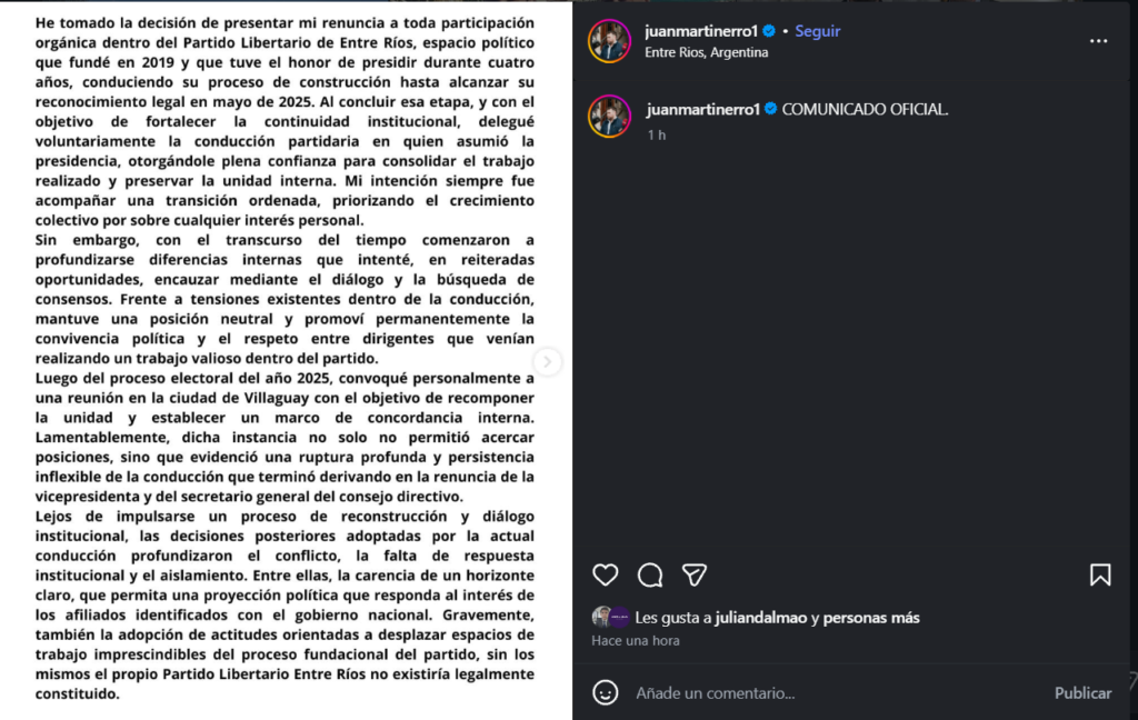 Erro explicó que su decisión responde a diferencias internas que no lograron resolverse pese a sus «intentos de diálogo». “Mi intención siempre fue acompañar una transición ordenada, priorizando el crecimiento colectivo por sobre cualquier interés personal”, señaló en su comunicado.
