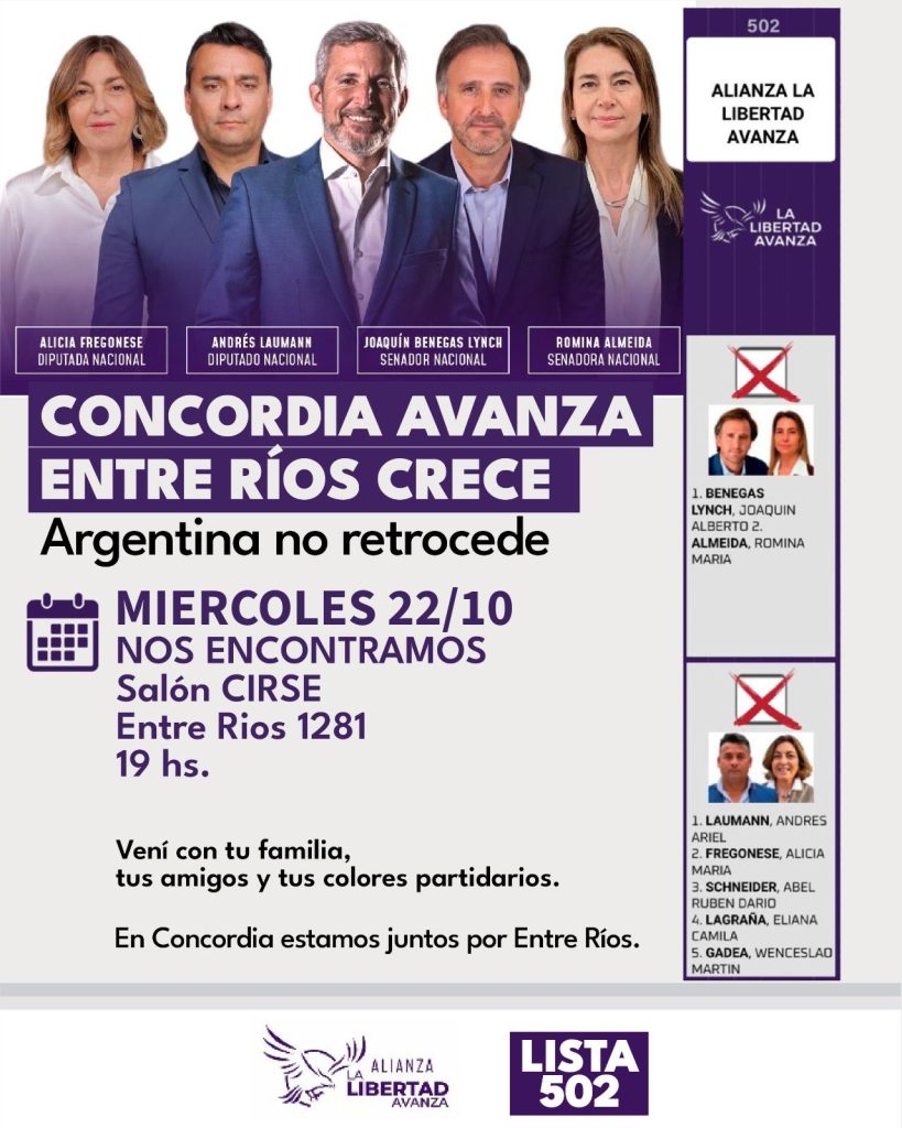 Durante los escasos días de campaña, que se intensificó en las últimas dos semanas antes del domingo 26, los equipos de militancia se dividieron la ciudad. No se los vio juntos a Lagraña y a Wenceslao Gadea, el candidato libertario que ocupa el quinto lugar a Diputados en la lista. Joaquín Benegas Lynch y Romina Almeida, candidatos al Senado, salieron a recorrer la provincia. Junto al candidato de apellido ilustre, se lo vio casi con asistencia perfecta a Gadea, que priorizó la geografía provincial por sobre su ciudad. En Concordia, la tarea recayó en Lagraña. Ninguno de los dos tiene chances concretas de ingresar al Congreso, pero ambos respondieron con creces al compromiso que cayó sobre sus espaldas: que Concordia le de un triunfo a LLA. Junto con Gualeguaychú, son las dos ciudades en las que Frigerio apuesta al triunfo, de mínima.