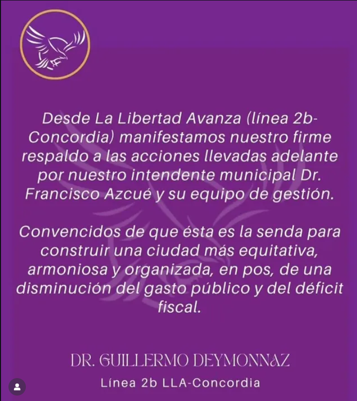 Por su parte, la línea alternativa a la conducción de la La Libertad Avanza en la ciudad publicó en sus redes sociales un comunicado en el que sostiene que «esta es la senda para construir una ciudad más equitativa, armoniosa y organizada, en pos de una disminución del gasto público y el déficit fiscal». Estas palabras fueron firmadas por Guillermo Deymmonaz, funcionario nacional y referente de la Lista 2 B que disputará las próximas elecciones internas, sin fecha definida aún.