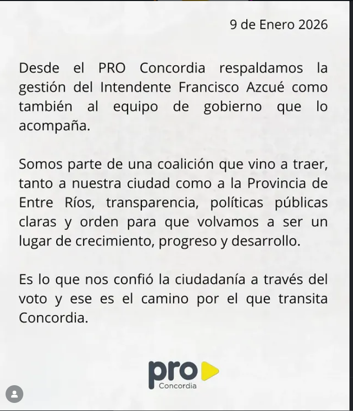 El PRO Concordia compartió un texto en el que defienden a la gestión local. «Respaldamos la gestión del intendente como también al equipo de gobierno que lo acompaña», dijeron.