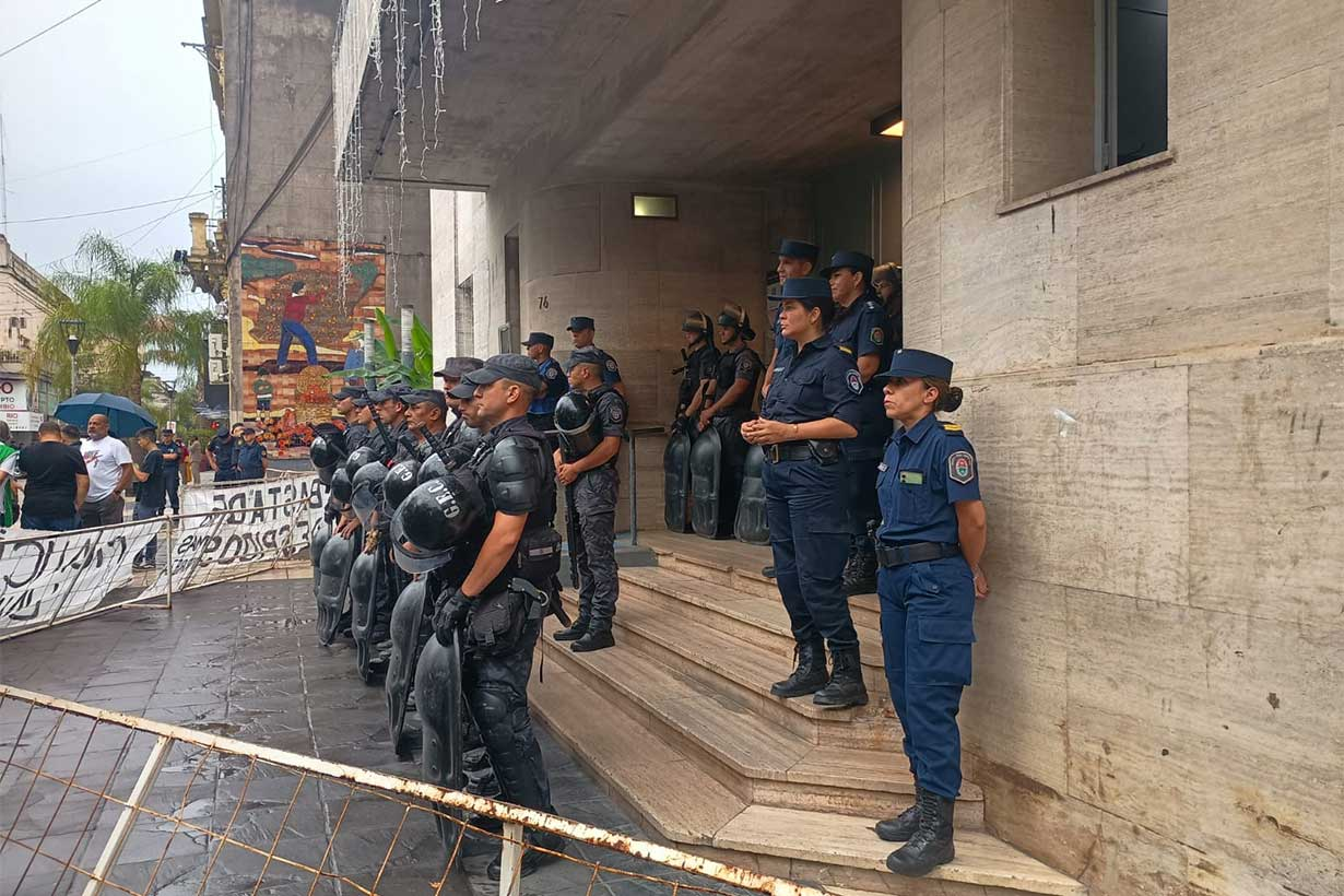 La concentración y posterior marcha fue seguida con máxima atención por decenas de policías desplegados tanto en el frente del palacio municipal como en la parte posterior y en toda la zona céntrica. Incluso pudo verse al Jefe de la Policía de Concordia, el Comisario José Rosatelli.