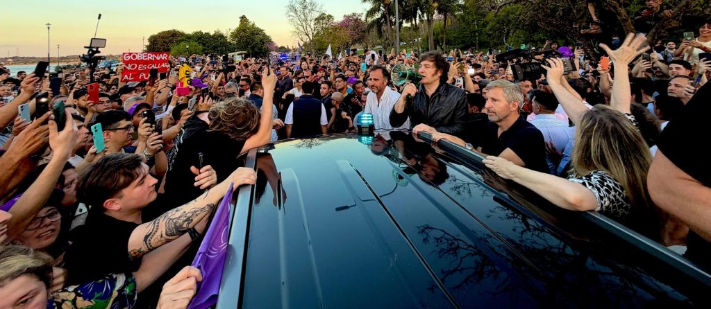 Arriba de una camioneta junto Frigerio, Milei agregó: “Estamos en un momento bisagra de la Argentina. Luego de semejante debacle y decadencia decidimos abrazar las ideas de la libertad en 2023. En ese sentido hemos bajado la inflación del 300% al 30%, hemos sacado de la pobreza a 12 millones de argentinos”.