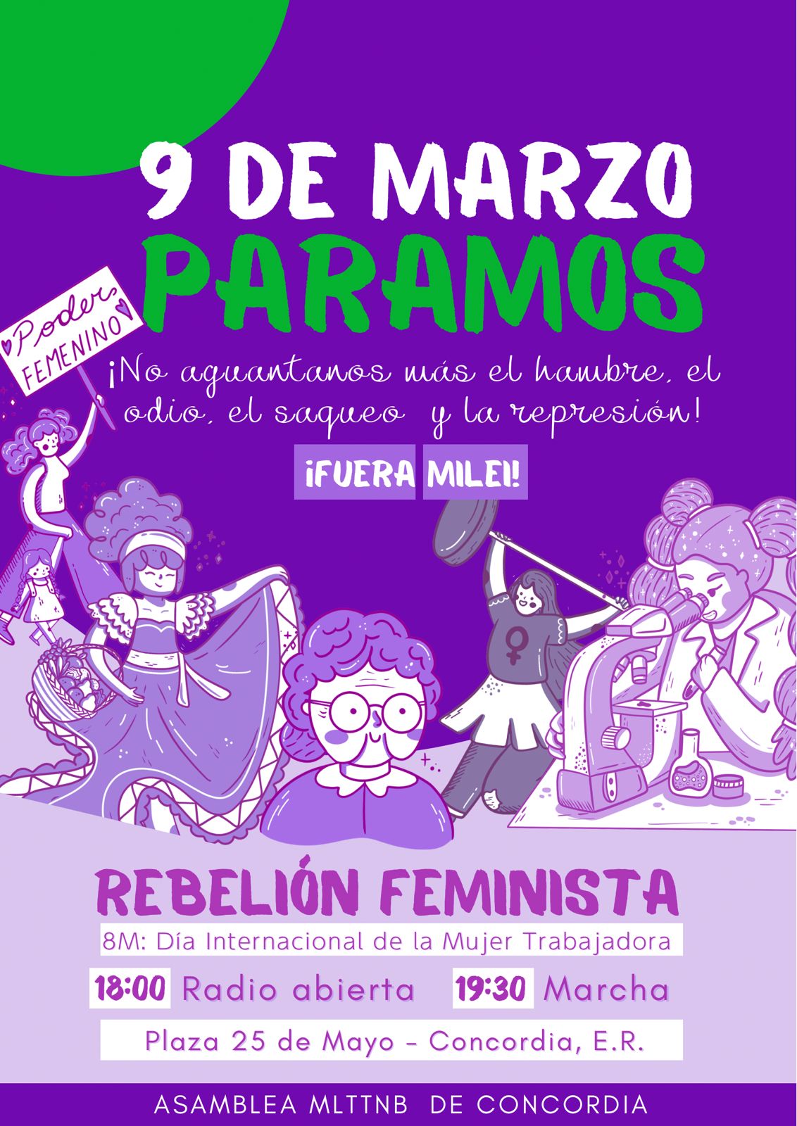 “Honramos a todas las mujeres que nos enseñaron a luchar: las inquilinas en huelga en 1907; las compañeras de los 70; las Madres y abuelas contra la dictadura; las docentes de la carpa blanca; las trabajadoras de la salud; las del grito Ni una Menos; las pibas de la marea verde; y por todas las compañeras que hoy están enfrentado este ajuste perverso de Milei y Frigerio. Por memoria, por justicia, por dignidad”, expresó la Asamblea Feminista.