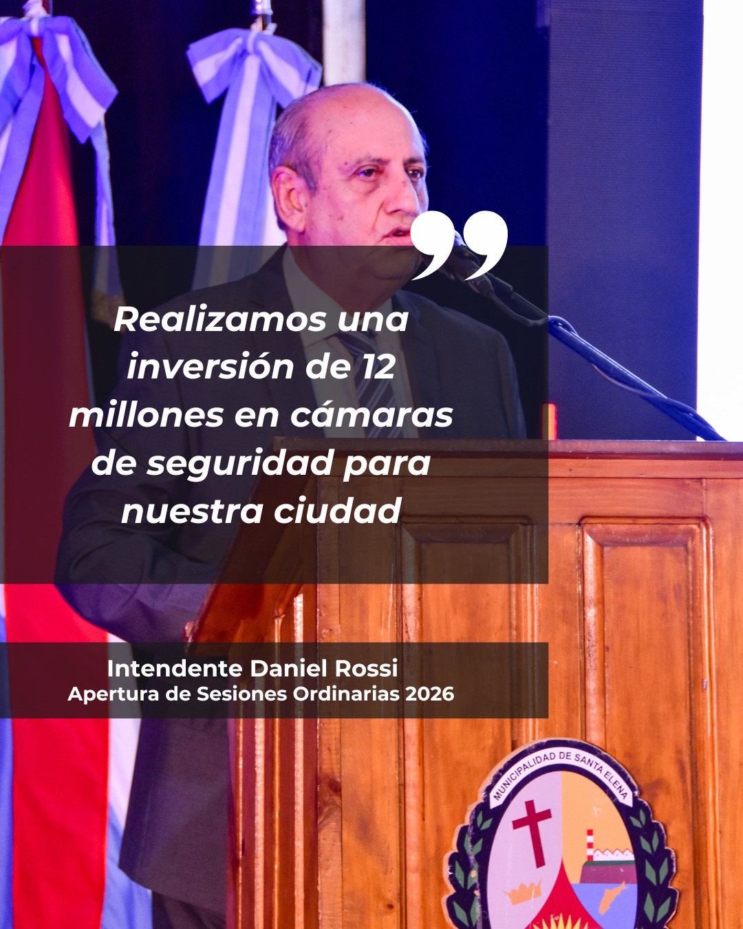 En su discurso mencionó inversiones realizadas en infraestructura urbana, ampliación de redes de servicios, mejoras en espacios públicos, fortalecimiento de la atención primaria de la salud y el acompañamiento a instituciones locales. En ese marco, reafirmó «el compromiso de continuar impulsando políticas públicas que contribuyan al crecimiento y al bienestar de los vecinos de Santa Elena».